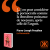 Pierre-Joseph Proudhon (1809-1865) est un journaliste, économiste et sociologue français qui se qualifiait lui-même d’anarchiste. Issu d’un milieu très modeste, il ira au collège grâce à une bourse, puis après avoir travaillé comme correcteur, fondera une petite imprimerie qui publiera son premier essai sur la grammaire. En 1838, il gagne un concours offrant une pension lui permettant de reprendre des études d’économie. En 1840, il publie Qu’est-ce que la propriété ? qui lui vaut une rapide notoriété. En 1846, après une courte relation avec Marx, il rompt avec lui qui, à sa Philosophie de la misère, répondra par Misère de la philosophie. Viscéralement hostile à toute violence, il soutient les insurgés de 1848, mais désapprouve l’action révolutionnaire et pense que la transformation de la société doit être avant tout morale.